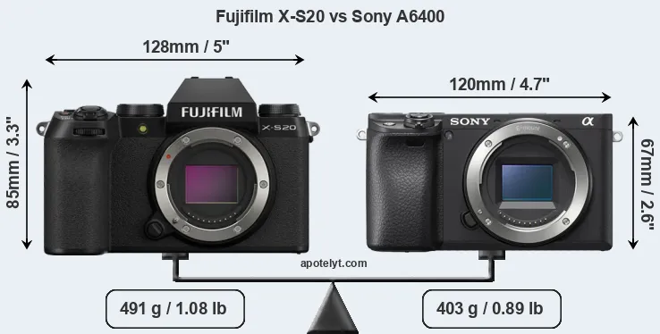 An illustration of the physical size and weight of the Fujifilm X-S20 and the Sony A6400 is provided in the side-by-side display below. The two cameras are presented according to their relative size. Three consecutive perspectives from the front, the top, and the back are available. All width, height and depth dimensions are rounded to the nearest millimeter.