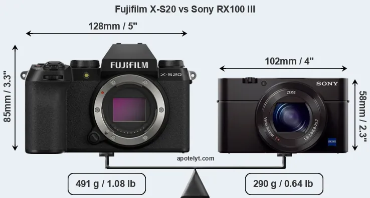The side-by-side display below illustrates the physical size and weight of the Fujifilm X-S20 and the Sony RX100 III. The two cameras are presented according to their relative size. Three successive views from the front, the top, and the rear are shown. All width, height and depth measures are rounded to the nearest millimeter.