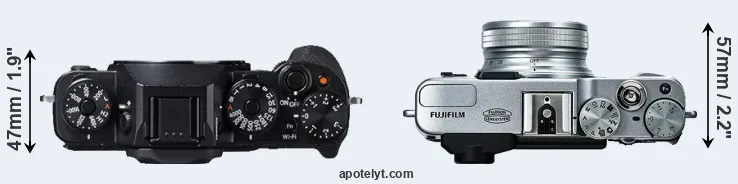 The side-by-side display below illustrates the physical size and weight of the Fujifilm X-T1 and the Fujifilm X20. The two cameras are presented according to their relative size. Three consecutive views from the front, the top, and the rear side are shown. All width, height and depth dimensions are rounded to the nearest millimeter.