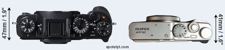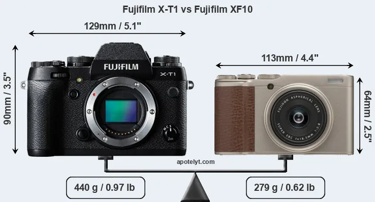 The physical size and weight of the Fujifilm X-T1 and the Fujifilm XF10 are illustrated in the side-by-side display below. The two cameras are presented according to their relative size. Three successive views from the front, the top, and the rear are shown. All width, height and depth measures are rounded to the nearest millimeter.