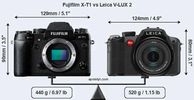 The side-by-side display below illustrates the physical size and weight of the Fujifilm X-T1 and the Leica V-LUX 2. The two cameras are presented according to their relative size. Three consecutive perspectives from the front, the top, and the back are available. All width, height and depth measures are rounded to the nearest millimeter.