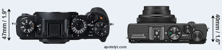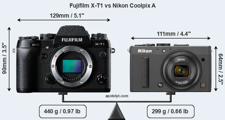 If the front view area (width x height) of the cameras is taken as an aggregate measure of their size, the Nikon Coolpix A is considerably smaller (39 percent) than the Fujifilm X-T1. It is worth mentioning in this context that the X-T1 is splash and dust resistant, while the Coolpix A does not feature any corresponding weather-sealing.