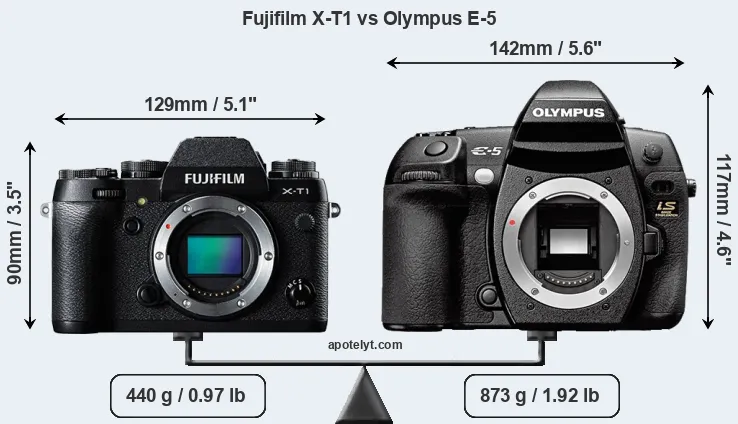 If the front view area (width x height) of the cameras is taken as an aggregate measure of their size, the Olympus E-5 is considerably larger (43 percent) than the Fujifilm X-T1. Moreover, the E-5 is substantially heavier (98 percent) than the X-T1. In this context, it is worth noting that both cameras are splash and dust-proof and can, hence, be used in inclement weather conditions or harsh environments.