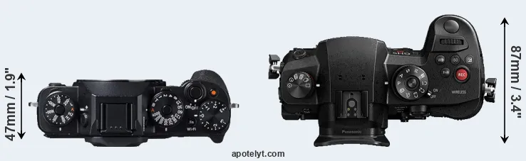 The physical size and weight of the Fujifilm X-T1 and the Panasonic GH5s are illustrated in the side-by-side display below. The two cameras are presented according to their relative size. Three consecutive views from the front, the top, and the rear side are shown. All size dimensions are rounded to the nearest millimeter.