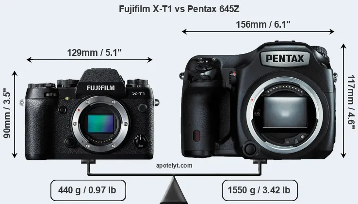 If the front view area (width x height) of the cameras is taken as an aggregate measure of their size, the Pentax 645Z is considerably larger (57 percent) than the Fujifilm X-T1. Moreover, the 645Z is substantially heavier (252 percent) than the X-T1. In this context, it is worth noting that both cameras are splash and dust-proof and can, hence, be used in inclement weather conditions or harsh environments.