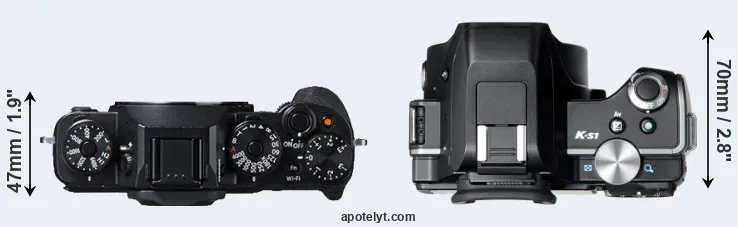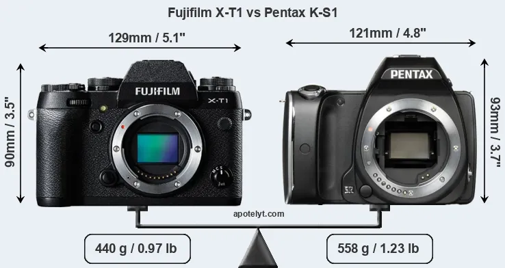 The physical size and weight of the Fujifilm X-T1 and the Pentax K-S1 are illustrated in the side-by-side display below. The two cameras are presented according to their relative size. Three consecutive perspectives from the front, the top, and the back are available. All size dimensions are rounded to the nearest millimeter.