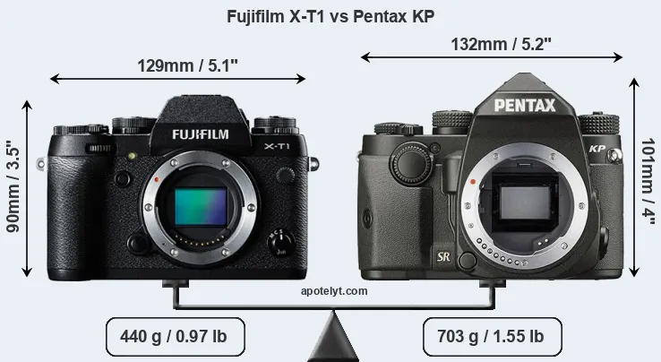 If the front view area (width x height) of the cameras is taken as an aggregate measure of their size, the Pentax KP is notably larger (15 percent) than the Fujifilm X-T1. Moreover, the KP is substantially heavier (60 percent) than the X-T1. In this context, it is worth noting that both cameras are splash and dust-proof and can, hence, be used in inclement weather conditions or harsh environments.