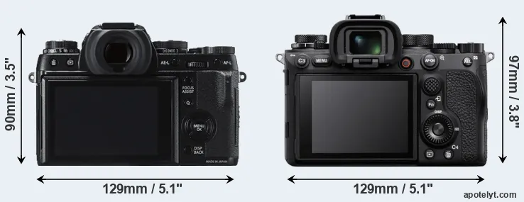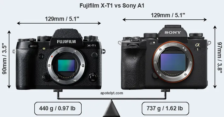 The physical size and weight of the Fujifilm X-T1 and the Sony A1 are illustrated in the side-by-side display below. The two cameras are presented according to their relative size. Three consecutive perspectives from the front, the top, and the back are available. All width, height and depth measures are rounded to the nearest millimeter.