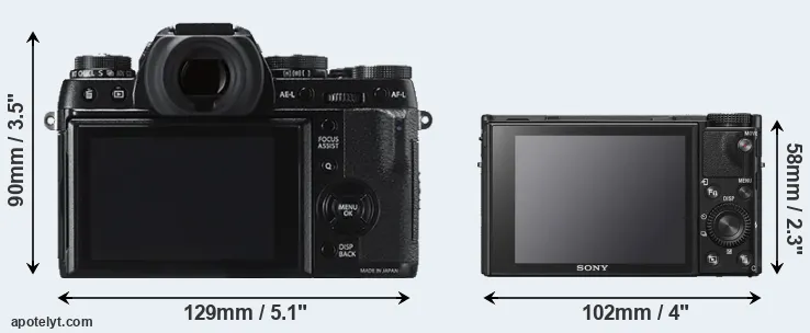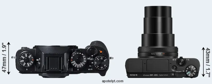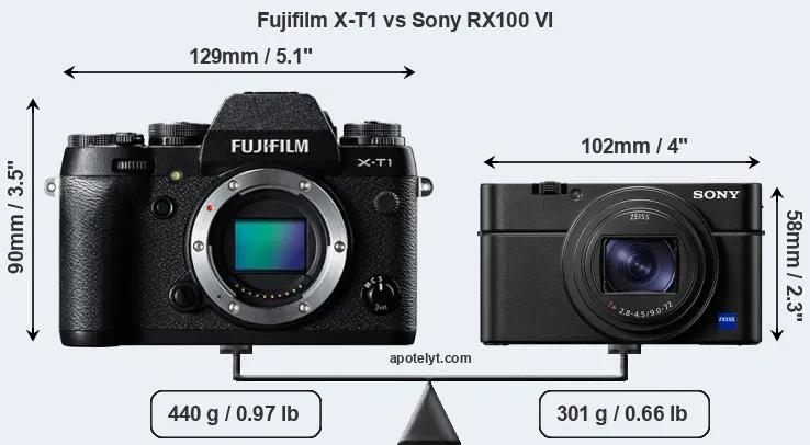 The side-by-side display below illustrates the physical size and weight of the Fujifilm X-T1 and the Sony RX100 VI. The two cameras are presented according to their relative size. Three consecutive perspectives from the front, the top, and the back are available. All width, height and depth measures are rounded to the nearest millimeter.