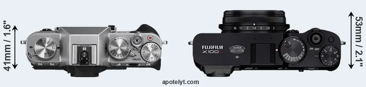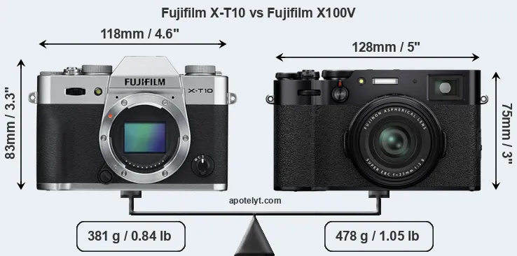 If the front view area (width x height) of the cameras is taken as an aggregate measure of their size, the Fujifilm X100V is somewhat smaller (2 percent) than the Fujifilm X-T10. It is noteworthy in this context that the X100V is splash and dust-proof, while the X-T10 does not feature any corresponding weather-sealing.