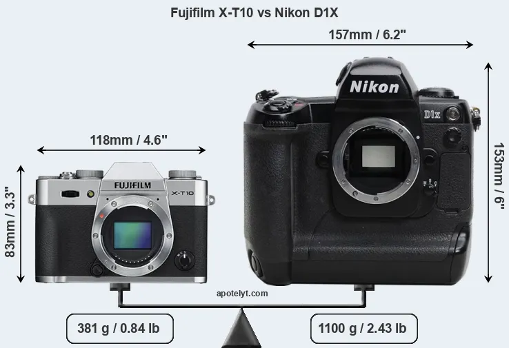 If the front view area (width x height) of the cameras is taken as an aggregate measure of their size, the Nikon D1X is considerably larger (145 percent) than the Fujifilm X-T10. Moreover, the D1X is substantially heavier (189 percent) than the X-T10. It is noteworthy in this context that the D1X is splash and dust-proof, while the X-T10 does not feature any corresponding weather-sealing.