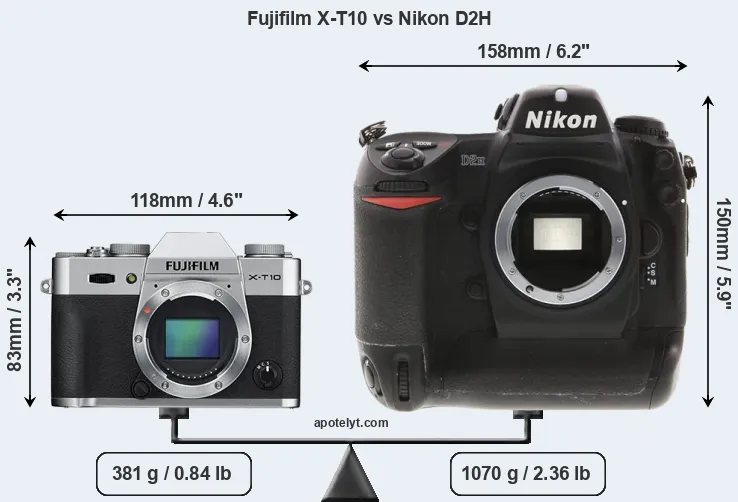 If the front view area (width x height) of the cameras is taken as an aggregate measure of their size, the Nikon D2H is considerably larger (142 percent) than the Fujifilm X-T10. Moreover, the D2H is substantially heavier (181 percent) than the X-T10. It is noteworthy in this context that the D2H is splash and dust-proof, while the X-T10 does not feature any corresponding weather-sealing.