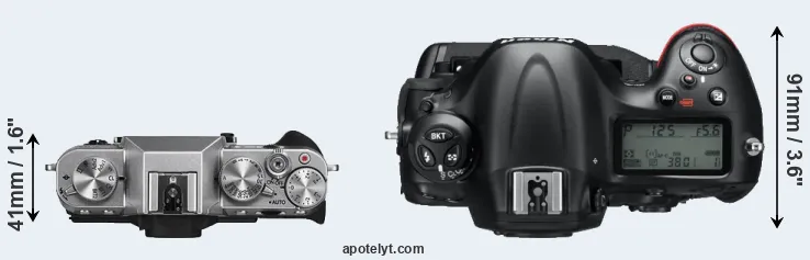 The side-by-side display below illustrates the physical size and weight of the Fujifilm X-T10 and the Nikon D4. The two cameras are presented according to their relative size. Three successive views from the front, the top, and the rear are shown. All width, height and depth measures are rounded to the nearest millimeter.