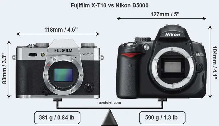 An illustration of the physical size and weight of the Fujifilm X-T10 and the Nikon D5000 is provided in the side-by-side display below. The two cameras are presented according to their relative size. Three consecutive perspectives from the front, the top, and the back are available. All width, height and depth measures are rounded to the nearest millimeter.
