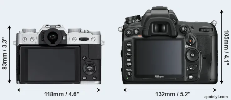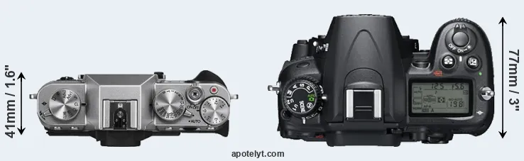 The physical size and weight of the Fujifilm X-T10 and the Nikon D7000 are illustrated in the side-by-side display below. The two cameras are presented according to their relative size. Three consecutive views from the front, the top, and the rear side are shown. All width, height and depth measures are rounded to the nearest millimeter.