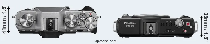 An illustration of the physical size and weight of the Fujifilm X-T10 and the Panasonic GF2 is provided in the side-by-side display below. The two cameras are presented according to their relative size. Three successive views from the front, the top, and the rear are shown. All width, height and depth measures are rounded to the nearest millimeter.
