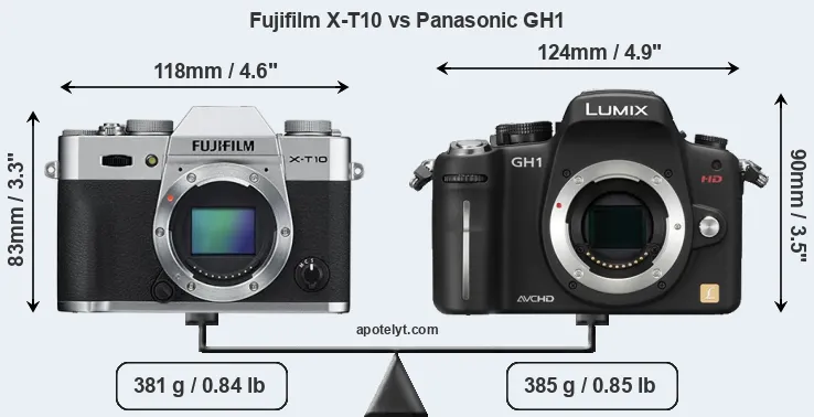 An illustration of the physical size and weight of the Fujifilm X-T10 and the Panasonic GH1 is provided in the side-by-side display below. The two cameras are presented according to their relative size. Three consecutive views from the front, the top, and the rear side are shown. All width, height and depth measures are rounded to the nearest millimeter.