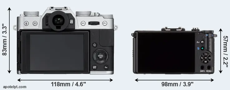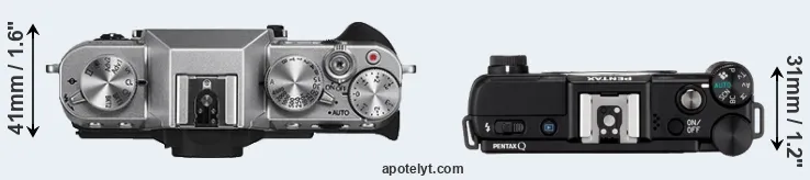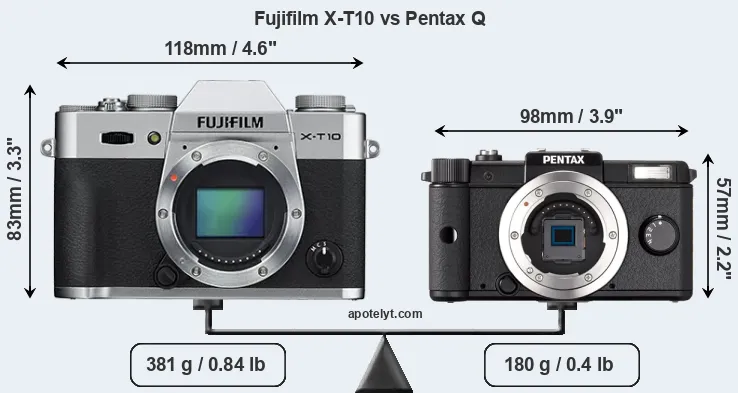 The side-by-side display below illustrates the physical size and weight of the Fujifilm X-T10 and the Pentax Q. The two cameras are presented according to their relative size. Three consecutive perspectives from the front, the top, and the back are available. All size dimensions are rounded to the nearest millimeter.
