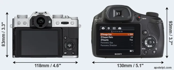 The side-by-side display below illustrates the physical size and weight of the Fujifilm X-T10 and the Sony HX350. The two cameras are presented according to their relative size. Three successive views from the front, the top, and the rear are shown. All width, height and depth measures are rounded to the nearest millimeter.