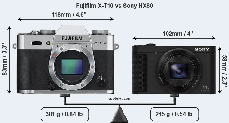 The above size and weight comparisons are to some extent incomplete and possibly misleading, as the HX80 has a lens built in, whereas the X-T10 is an interchangeable lens camera that requires a separate lens. Attaching the latter will add extra weight and bulk to the setup. You can compare the optics available for the X-T10 and their specifications in the Fujinon X Lens Catalog.