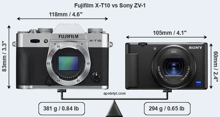 The above size and weight comparisons are to some extent incomplete and possibly misleading, as the ZV-1 has a lens built in, whereas the X-T10 is an interchangeable lens camera that requires a separate lens. Attaching the latter will add extra weight and bulk to the setup. You can compare the optics available for the X-T10 and their specifications in the Fujinon X Lens Catalog.