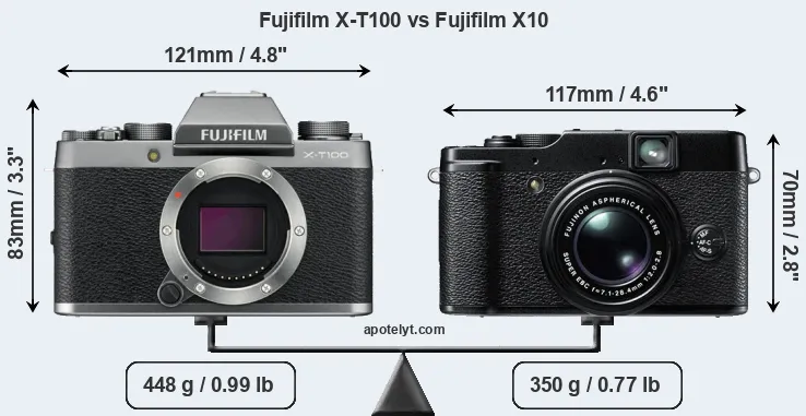 The physical size and weight of the Fujifilm X-T100 and the Fujifilm X10 are illustrated in the side-by-side display below. The two cameras are presented according to their relative size. Three successive views from the front, the top, and the rear are shown. All width, height and depth measures are rounded to the nearest millimeter.