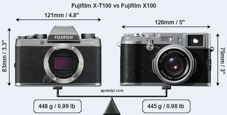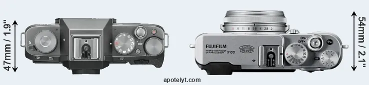 The side-by-side display below illustrates the physical size and weight of the Fujifilm X-T100 and the Fujifilm X100. The two cameras are presented according to their relative size. Three successive views from the front, the top, and the rear are shown. All width, height and depth dimensions are rounded to the nearest millimeter.