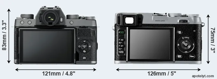 If the front view area (width x height) of the cameras is taken as an aggregate measure of their size, the Fujifilm X100 is notably smaller (6 percent) than the Fujifilm X-T100. In this context, it is worth noting that neither the X-T100 nor the X100 are weather-sealed.