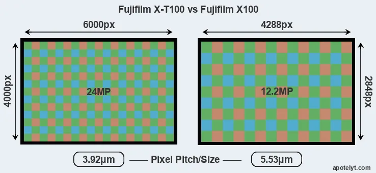 Despite having a slightly smaller sensor, the Fujifilm X-T100 offers a higher resolution of 24 megapixels, compared with 12.2 MP of the Fujifilm X100. This megapixels advantage comes at the cost of a higher pixel density and a smaller size of the individual pixel (with a pixel pitch of 3.92μm versus 5.53μm for the X100). However, it should be noted that the X-T100 is much more recent (by 7 years and 8 months) than the X100, and its sensor will have benefitted from technological advances during this time that make it possible to gather light more efficiently.