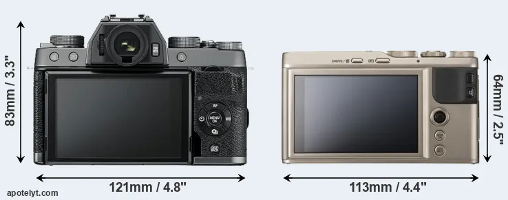 The physical size and weight of the Fujifilm X-T100 and the Fujifilm XF10 are illustrated in the side-by-side display below. The two cameras are presented according to their relative size. Three successive views from the front, the top, and the rear are shown. All width, height and depth measures are rounded to the nearest millimeter.