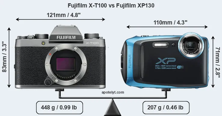 The physical size and weight of the Fujifilm X-T100 and the Fujifilm XP130 are illustrated in the side-by-side display below. The two cameras are presented according to their relative size. Three consecutive perspectives from the front, the top, and the back are available. All width, height and depth dimensions are rounded to the nearest millimeter.