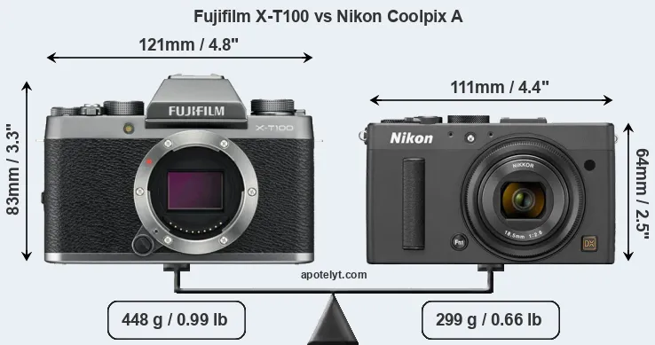 The side-by-side display below illustrates the physical size and weight of the Fujifilm X-T100 and the Nikon Coolpix A. The two cameras are presented according to their relative size. Three consecutive perspectives from the front, the top, and the back are available. All width, height and depth measures are rounded to the nearest millimeter.