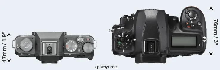 The physical size and weight of the Fujifilm X-T100 and the Nikon D780 are illustrated in the side-by-side display below. The two cameras are presented according to their relative size. Three consecutive perspectives from the front, the top, and the back are available. All width, height and depth dimensions are rounded to the nearest millimeter.