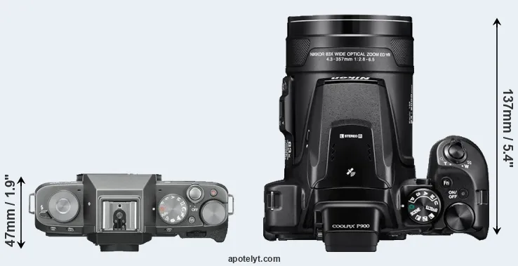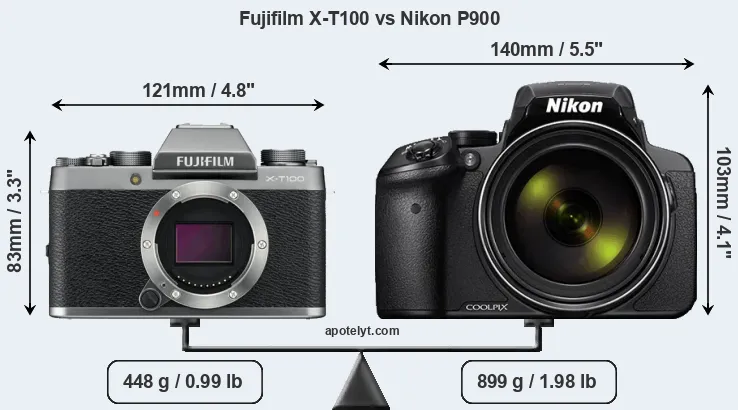 The side-by-side display below illustrates the physical size and weight of the Fujifilm X-T100 and the Nikon P900. The two cameras are presented according to their relative size. Three consecutive perspectives from the front, the top, and the back are available. All width, height and depth measures are rounded to the nearest millimeter.