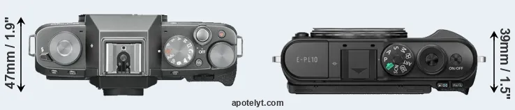 The physical size and weight of the Fujifilm X-T100 and the Olympus E-PL10 are illustrated in the side-by-side display below. The two cameras are presented according to their relative size. Three consecutive views from the front, the top, and the rear side are shown. All width, height and depth dimensions are rounded to the nearest millimeter.