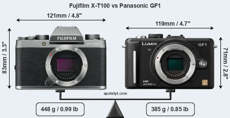 An illustration of the physical size and weight of the Fujifilm X-T100 and the Panasonic GF1 is provided in the side-by-side display below. The two cameras are presented according to their relative size. Three successive views from the front, the top, and the rear are shown. All width, height and depth dimensions are rounded to the nearest millimeter.