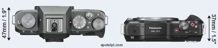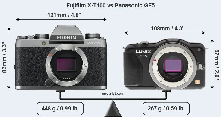 The side-by-side display below illustrates the physical size and weight of the Fujifilm X-T100 and the Panasonic GF5. The two cameras are presented according to their relative size. Three successive views from the front, the top, and the rear are shown. All width, height and depth dimensions are rounded to the nearest millimeter.