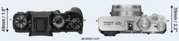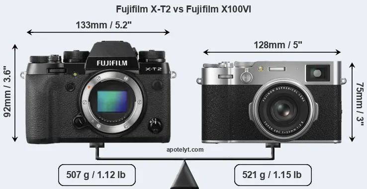 The side-by-side display below illustrates the physical size and weight of the Fujifilm X-T2 and the Fujifilm X100VI. The two cameras are presented according to their relative size. Three consecutive views from the front, the top, and the rear side are shown. All size dimensions are rounded to the nearest millimeter.