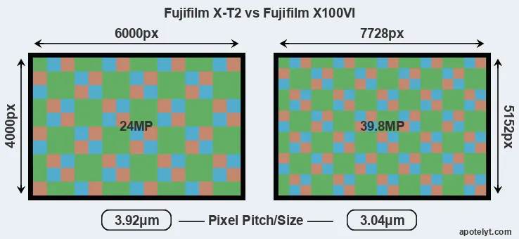 | Sensor Specs | Fujifilm X-T2 | Fujifilm X100VI |