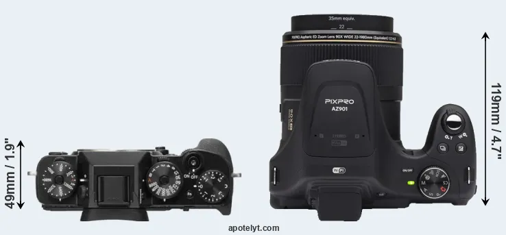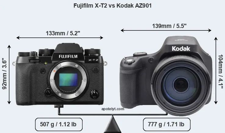 The side-by-side display below illustrates the physical size and weight of the Fujifilm X-T2 and the Kodak AZ901. The two cameras are presented according to their relative size. Three consecutive perspectives from the front, the top, and the back are available. All width, height and depth measures are rounded to the nearest millimeter.