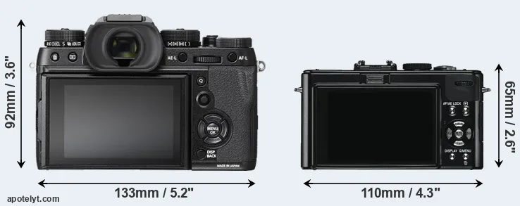 If the front view area (width x height) of the cameras is taken as an aggregate measure of their size, the Leica D-LUX 5 is considerably smaller (42 percent) than the Fujifilm X-T2. It is worth mentioning in this context that the X-T2 is splash and dust resistant, while the D-LUX 5 does not feature any corresponding weather-sealing.