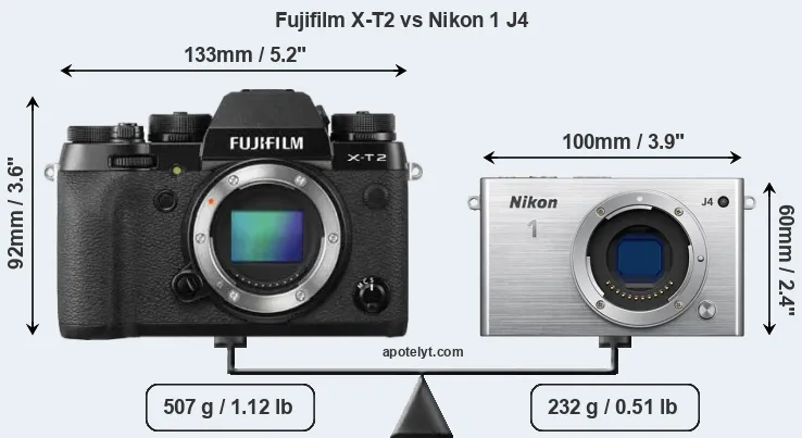 The side-by-side display below illustrates the physical size and weight of the Fujifilm X-T2 and the Nikon 1 J4. The two cameras are presented according to their relative size. Three consecutive perspectives from the front, the top, and the back are available. All width, height and depth dimensions are rounded to the nearest millimeter.
