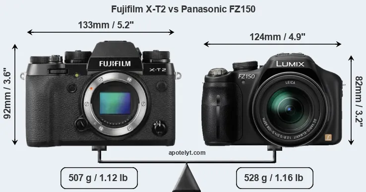 The physical size and weight of the Fujifilm X-T2 and the Panasonic FZ150 are illustrated in the side-by-side display below. The two cameras are presented according to their relative size. Three consecutive perspectives from the front, the top, and the back are available. All width, height and depth dimensions are rounded to the nearest millimeter.