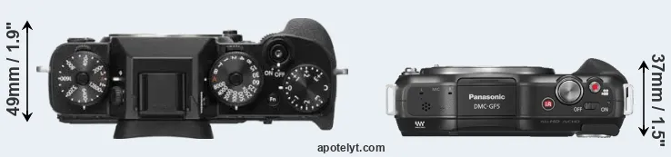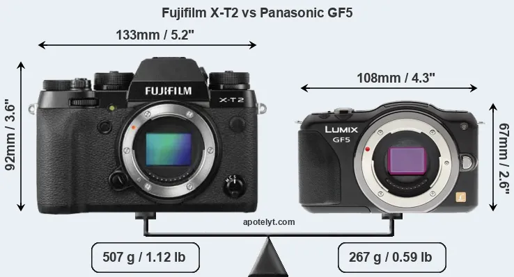 The side-by-side display below illustrates the physical size and weight of the Fujifilm X-T2 and the Panasonic GF5. The two cameras are presented according to their relative size. Three consecutive views from the front, the top, and the rear side are shown. All width, height and depth dimensions are rounded to the nearest millimeter.