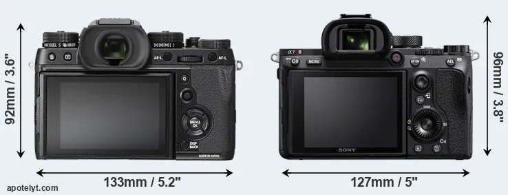 The side-by-side display below illustrates the physical size and weight of the Fujifilm X-T2 and the Sony A7R III. The two cameras are presented according to their relative size. Three successive views from the front, the top, and the rear are shown. All size dimensions are rounded to the nearest millimeter.