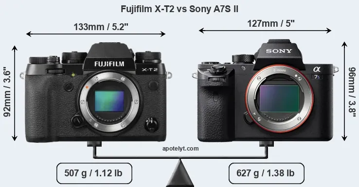 If the front view area (width x height) of the cameras is taken as an aggregate measure of their size, the Fujifilm X-T2 and the Sony A7S II are of equal size. However, the A7S II is markedly heavier (24 percent) than the X-T2. In this context, it is worth noting that both cameras are splash and dust-proof and can, hence, be used in inclement weather conditions or harsh environments.