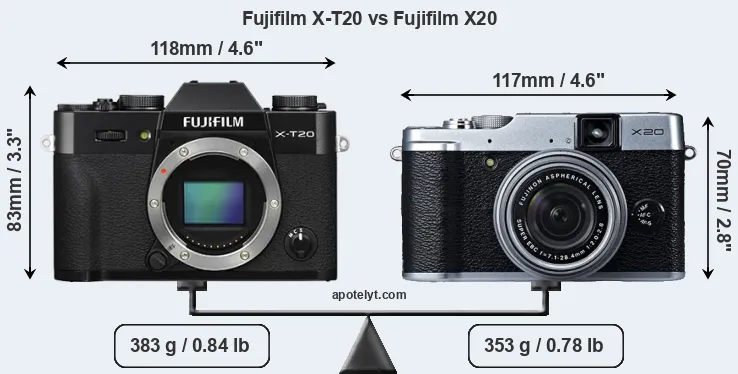 The physical size and weight of the Fujifilm X-T20 and the Fujifilm X20 are illustrated in the side-by-side display below. The two cameras are presented according to their relative size. Three consecutive perspectives from the front, the top, and the back are available. All width, height and depth dimensions are rounded to the nearest millimeter.