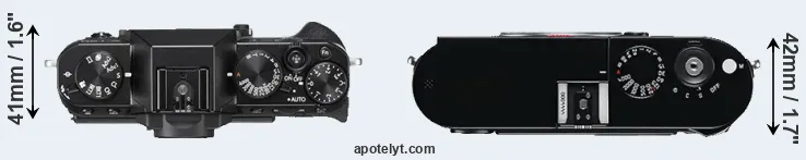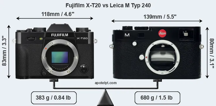 The physical size and weight of the Fujifilm X-T20 and the Leica M Typ 240 are illustrated in the side-by-side display below. The two cameras are presented according to their relative size. Three consecutive perspectives from the front, the top, and the back are available. All width, height and depth dimensions are rounded to the nearest millimeter.
