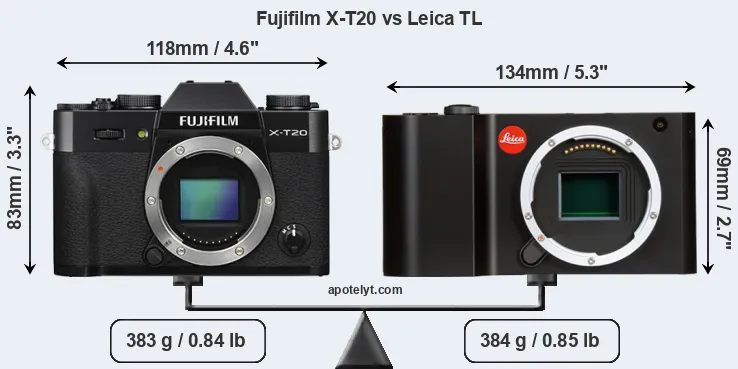 An illustration of the physical size and weight of the Fujifilm X-T20 and the Leica TL is provided in the side-by-side display below. The two cameras are presented according to their relative size. Three successive views from the front, the top, and the rear are shown. All width, height and depth dimensions are rounded to the nearest millimeter.