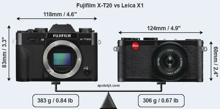 If the front view area (width x height) of the cameras is taken as an aggregate measure of their size, the Leica X1 is notably smaller (24 percent) than the Fujifilm X-T20. In this context, it is worth noting that neither the X-T20 nor the X1 are weather-sealed.